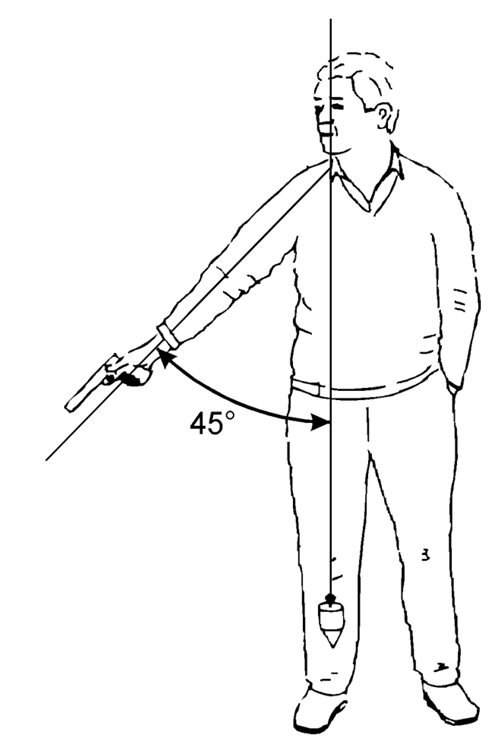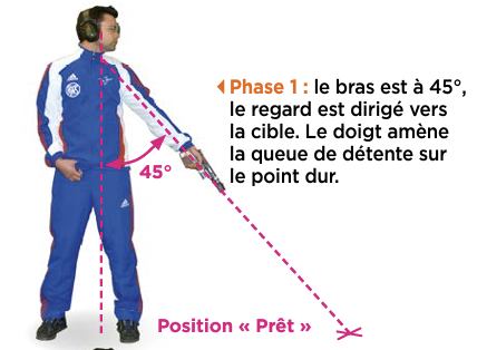 Dans la position «PRET», le bras de l’athlète ne doit pas être levé à plus de 45° de la verticale, et le pistolet ne doit pas être pointé en arrière de la ligne de tir (coté tireur).